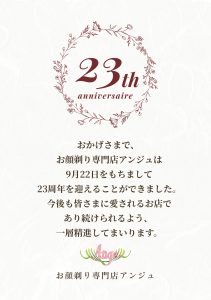 23周年を迎えました 2025.09.22お知らせ HOME お知らせ お知らせ 23周年を迎えました 広島県竹原市にお顔剃り専門店として開業して23年を迎えました。 女性のお顔剃りがまだメジャーでなかった平成14年、試行錯誤のうえのオープンでした。 今後も、お顔剃り専門店アンジュは皆さまに愛されるお店であり続けられるよう、 一層精進してまいります。 なにとぞ、末永く御贔屓賜りますようお願い申し上げます。 有限会社藤川 お顔剃り専門店アンジュ ※店内をプチリニューアル中です。 少しずつ進化するアンジュにご期待くださいね。 お知らせ 【お知らせ】竹原市|お顔剃り専門店アンジュ9月営業のお知らせ 最近の記事 2025.09.22 23周年を迎えました 2025.08.30 【お知らせ】竹原市|お顔剃り専門店アンジュ9月営業の... 2025.08.01 【お知らせ】竹原市|お顔剃り専門店アンジュ 8月営業... 2025.07.09 竹原市|お顔剃り専門店アンジュ 夏こそお顔剃り! カテゴリー おすすめアイテム お知らせ 勉強会のお知らせ 季節のこと 講座・セミナー アーカイブ 2025年9月 (1) 2025年8月 (2) 2025年7月 (2) 2025年6月 (1) 2025年5月 (2) 2025年4月 (1) 2025年3月 (1) 2025年1月 (2) 2024年8月 (1) 2023年11月 (1) 2023年9月 (1) 2023年8月 (1) 2023年7月 (1) 2023年1月 (1) 2022年7月 (1) 2022年1月 (1) 2021年10月 (1) 2021年7月 (1) 2021年5月 (2) 2021年4月 (1) 2021年3月 (1) 2021年2月 (2) 2021年1月 (2) 2020年12月 (3) 2020年11月 (1) 2020年10月 (3) 2020年9月 (2) 2020年8月 (3) 2020年7月 (5) 2020年6月 (4) 2020年5月 (5) 2020年4月 (3) 2020年3月 (1)
